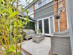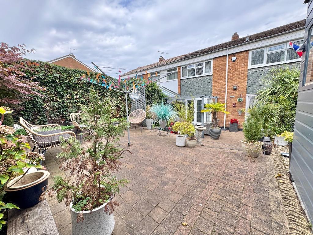 With tiered paved garden, pagoda, wooden shed, access to front elevation, gravelled area and fence to borders.