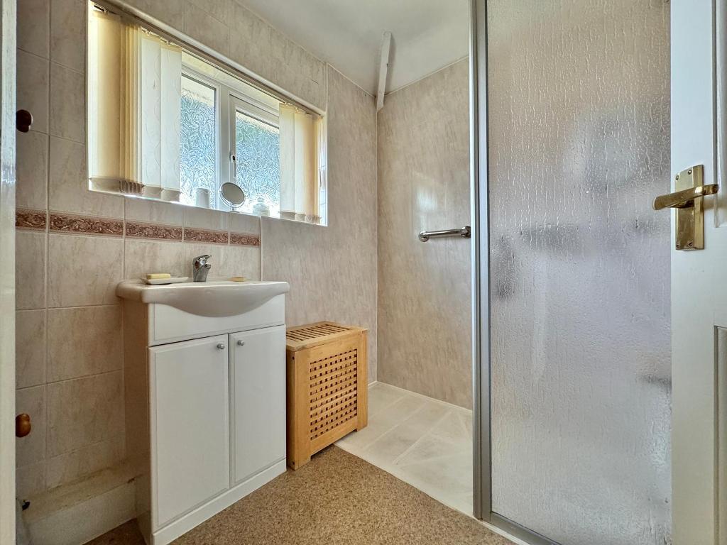 6' 1'' x 6' 0'' (1.87m x 1.83m) With hand wash basin set within vanity unit, double glazed window to rear elevation, chrome heated towel rail, electric shower with glass panel, part tiled wall and part vinyl splashback and storage.