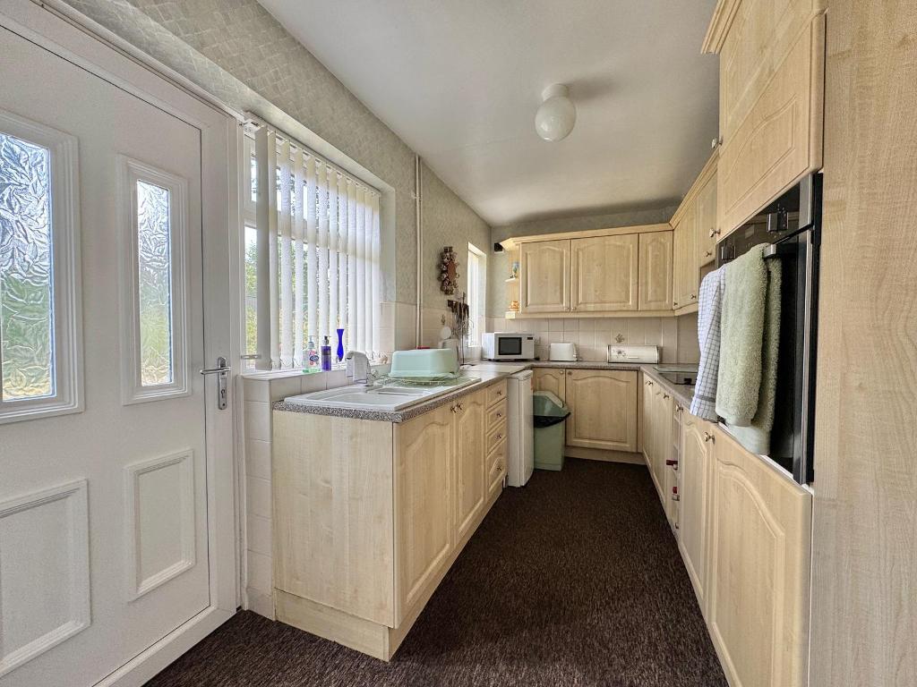 13' 5'' x 6' 11'' (4.11m x 2.12m) With wall and base units to match, one and a half sink and drainer, splashback tiling, double glazed window to rear elevation, double glazed door to rear elevation, electric hob, electric oven, plumbing for washing machine, storage, understairs storage and extractor.
