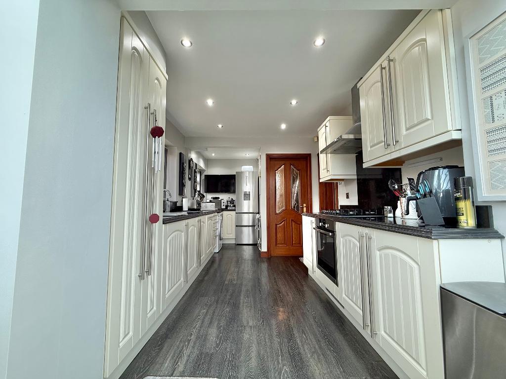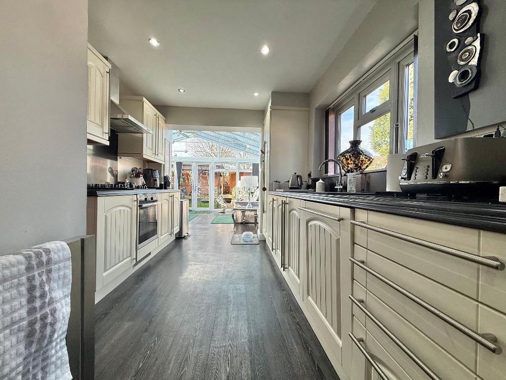17' 5'' x 8' 9'' (5.32m x 2.67m) With laminate flooring, double glazed windows to side elevation, central heating radiator, stainless steel sink with mixer tap, spotlights, integrated dishwasher, washing machine, gas hob, extractor, single glazed wooden door to lounge, wall and base units to match and storage cupboard housing "Worcester Bosch" boiler.