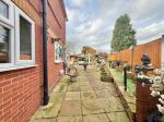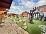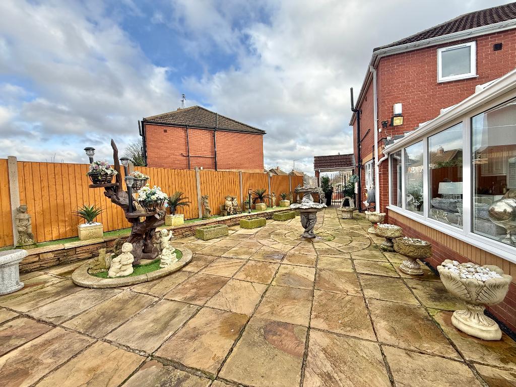 With paved patio, access to front, fence to borders, step up to artificial lawned area, two wooden shed/cabins with electric supply, purpose built fish pond, outdoor tap, outside electric supply and paved rear area with gated access to public pathway.