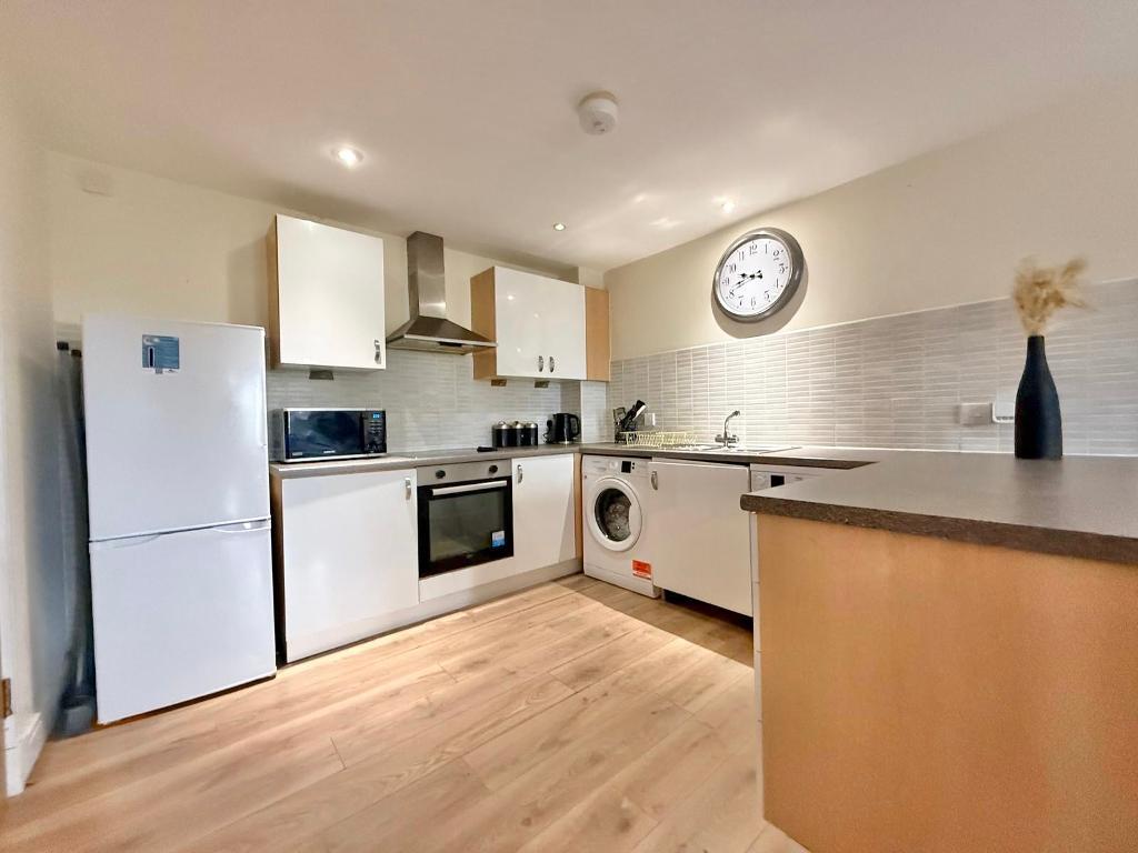 23' 11'' x 10' 0'' (7.3m x 3.05m) With laminate flooring, TV point, double glazed French doors to balcony, storage heater, smoke alarm, spotlights, part tiled walls, dishwasher, plumbing for washing machine, wall and base units to match, electric oven and hob and extractor fan.